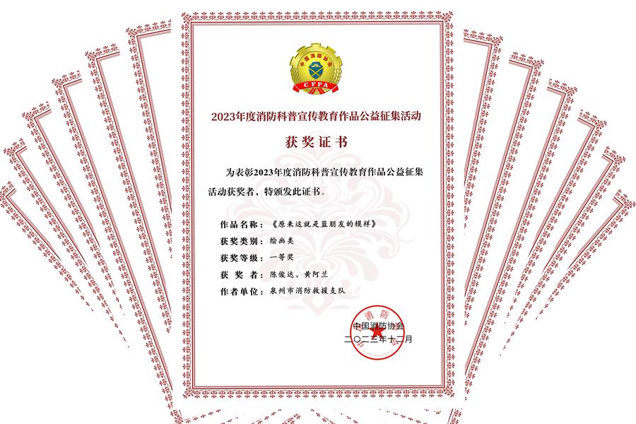 近日,由中国消防协会组织开展的“2023年度消防科普宣传教育作品公益征集活动”获奖名单正式出炉,泉州支队选送的13个消防科普教育作品从全国一众优秀作品中脱颖而出,分别是《原来这就是蓝朋友的模样》《了不起的消防“黑科技”》《用火不离人》《消防安全无小事系列科普短视频》获得一等奖,《过程》《致英雄》《消防微实验系列科普视频》获得二等奖,《消防“5+3”》《妈妈说这次她真的懂了》《人民英雄消防战士》《我眼中的火焰蓝》《消防英雄》《消防安全那些事儿系列》获得三等奖。