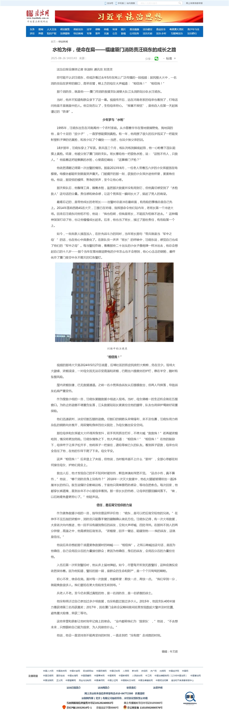 8月26日,法治日报报道了《水枪为伴,使命在肩——福建厦门消防员汪晓东的成长之路》,原文如下: