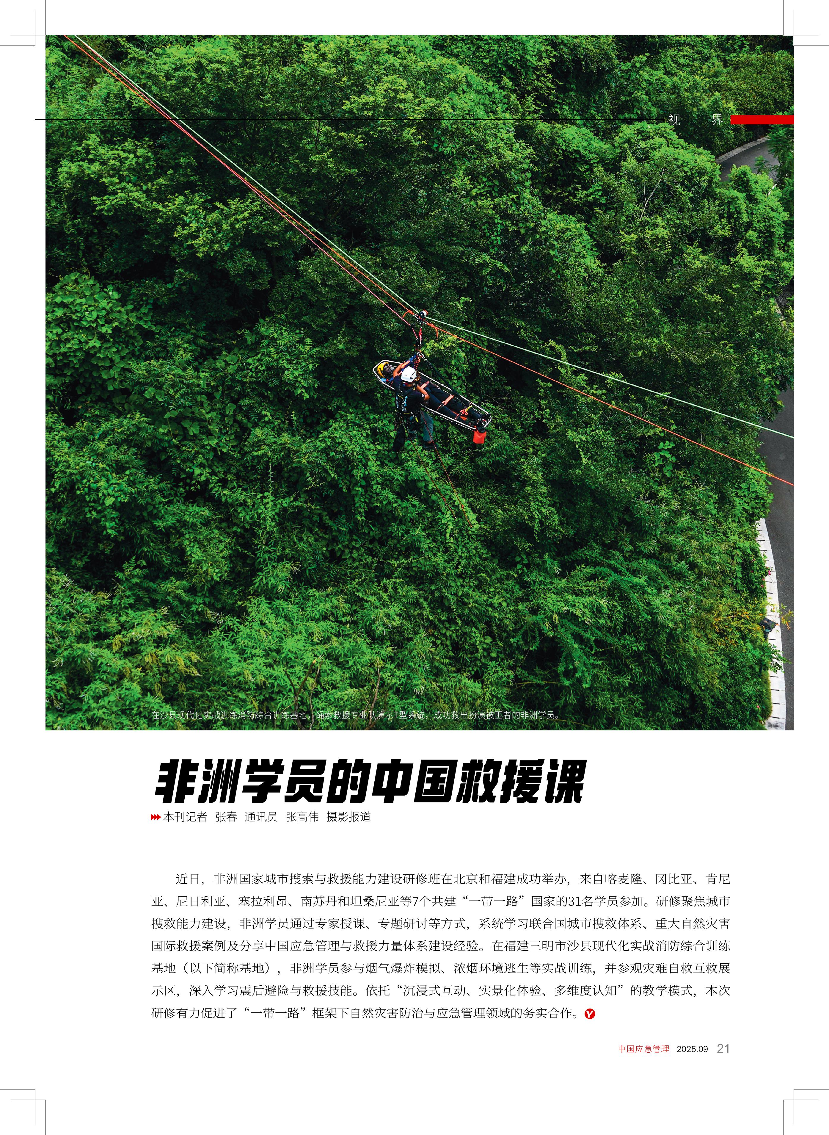 近日,《中国应急管理》杂志2025年第9期以《非洲学员的中国救援课》为题,介绍非洲国家学员来到三明沙县基地参观培训火灾救援场景和工作,原文见图。