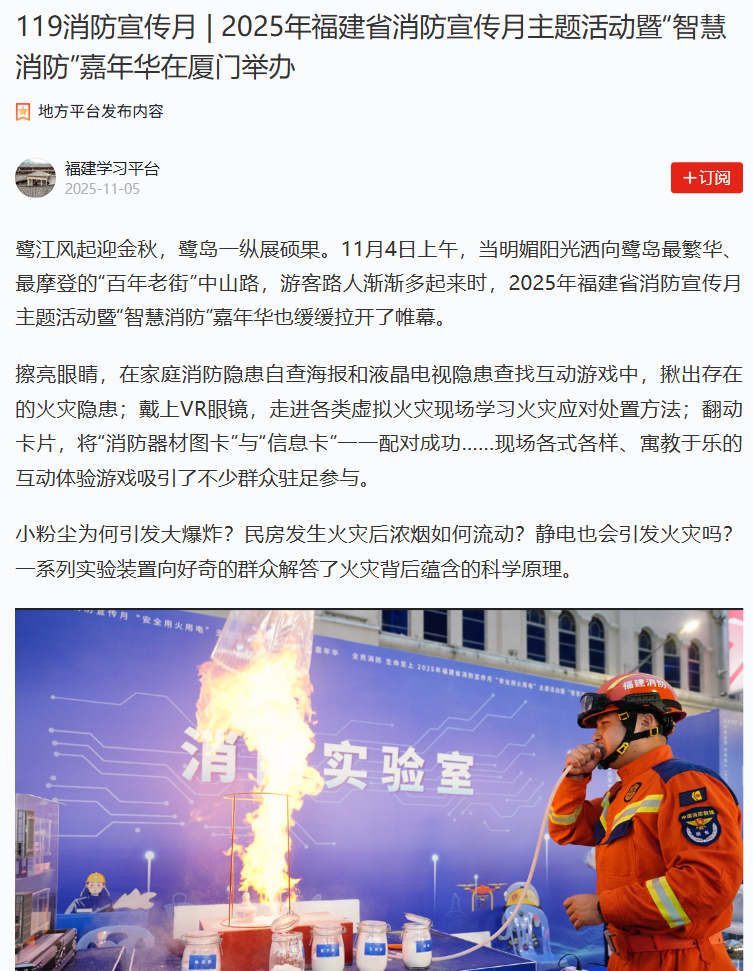 此次活动由福建省消安委、省消防救援总队主办,厦门市消防救援支队承办,现场通过科普游园活动和系列舞台节目,吸引群众在游玩参观中学习消防安全知识与技能,充分展示福建省“智慧消防综合服务平台”(以下简称“智慧消防”平台)与基层消防安全治理体系深度融合的建设成果,感受“智慧消防”给火灾防控工作带来的诸多利好变化和实用便民服务。