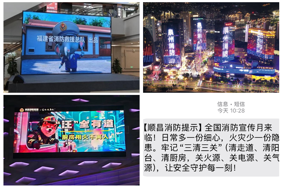 各地多点发力,推动消防宣传深度融入群众日常生活场景。泉州在东海泰禾广场、田安大桥等核心地标开展“为消防闪耀”灯光秀,以光影致敬火焰蓝;福州、莆田、南平等地协调影院、KTV、商场在影片开场、点歌界面、购物区域播放消防提示,提醒群众熟悉逃生通道、杜绝“飞线充电”;莆田支队还联合广电网络,在电视开机画面推送安全海报及OSD滚动字幕,惠及千家万户。同时,南平支队依托短信载体和社区微信群矩阵,精准发送消防安全提示、火灾案例警示及自防自救指南,打通宣传“最后一米”。
