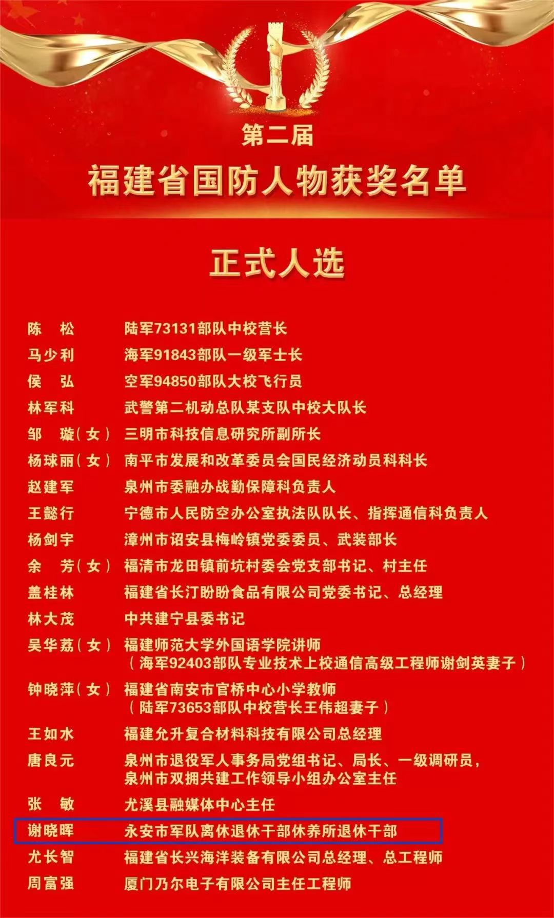 据了解,此次评选活动是由中共福建省委宣传部、省退役军人事务厅、省军区政治工作局联合开展,旨在深入学习贯彻习近平新时代中国特色社会主义思想,在全社会营造关心国防、热爱国防、建设国防、保卫国防的浓厚氛围。活动经各区市和省直单位逐级推荐、事迹初审、群众评议、专家评审,最终确定了20名正式人选和18名提名人选。
