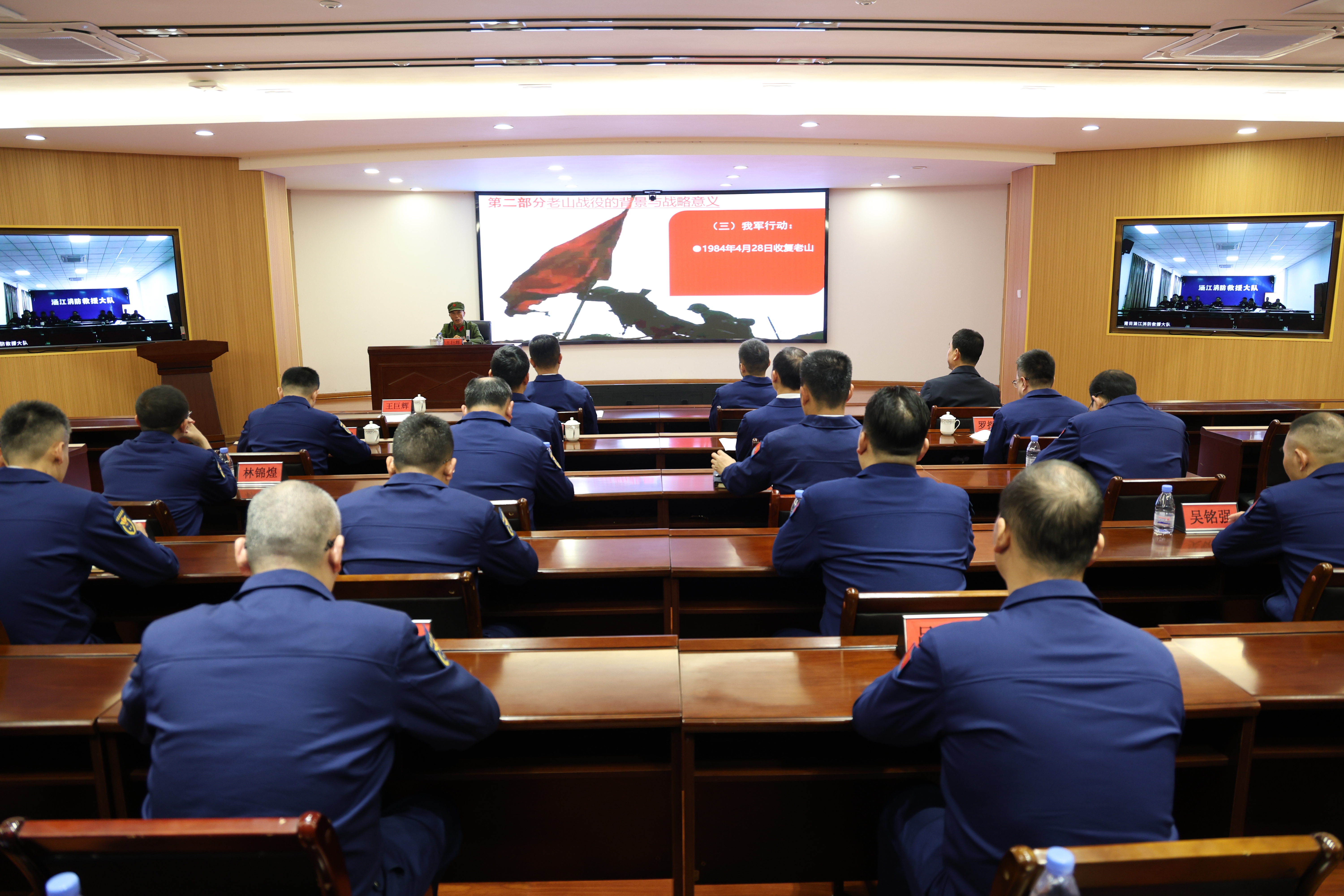 支队主官代表支队党委向王巨辉同志献花,致以崇高敬意和诚挚感谢。并号召全体消防救援人员要以此次宣讲为契机,深学细悟老山精神的丰富内涵与时代价值,把传承红色精神与树立和践行正确政绩观紧密结合。